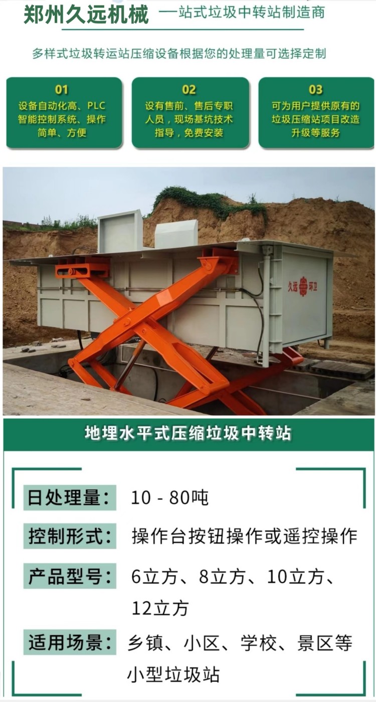 水平式生活垃圾壓縮中轉設備是將垃圾的卸(出)料、壓縮、儲存集合在一起,整體落于地下,利用地下空間將垃圾密閉在箱體內,地面上無垃圾外露現(xiàn)象,壓縮垃圾產(chǎn)生的污水經(jīng)排污管道直接流入污水井內,然后由污水泵排到城市污水管網(wǎng),徹底解決了垃圾在收集、儲存、裝運過程中的污染環(huán)境、作業(yè)效率低等問題。