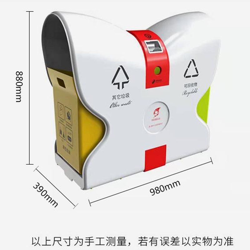 4.側板文字標識采用絲網(wǎng)印刷,印刷有“可回收物” “其他垃圾”,分類標識參照《城市生活垃圾分類標識》規(guī)定的名稱、圖形、符號和顏色要求,LOGO可定制。